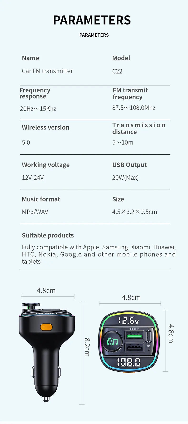 Works with all cars, 12V/24V, and all Bluetooth-enabled devices.