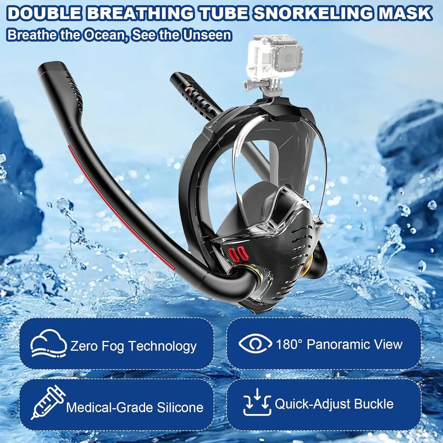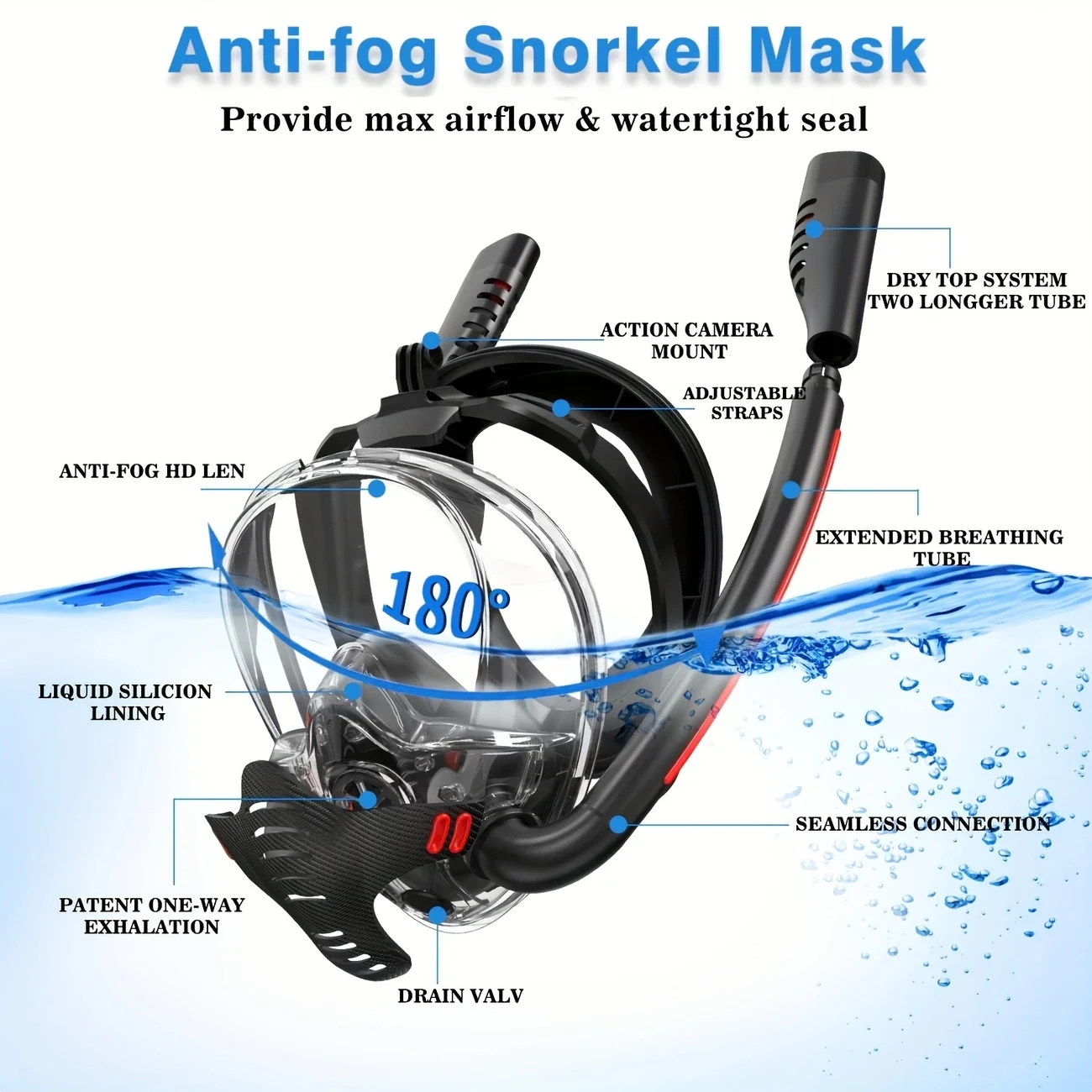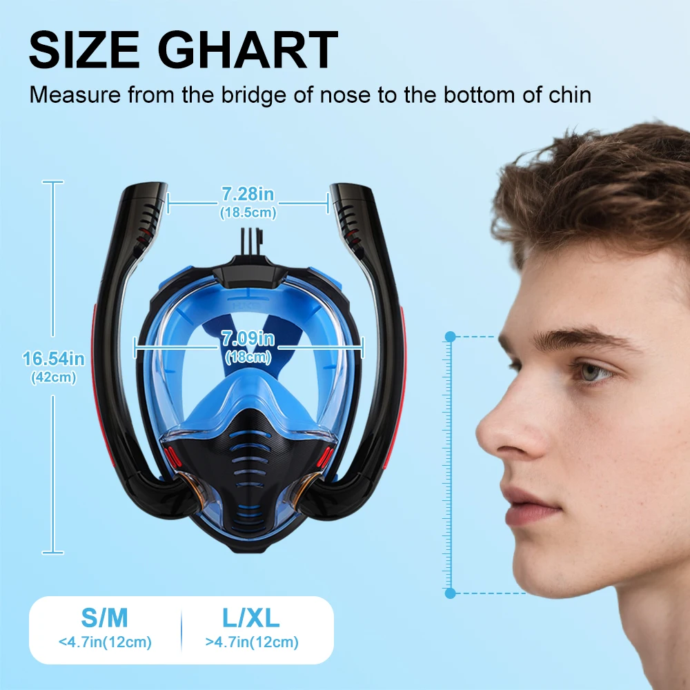 Full Face 180° Snorkel Mask | Anti-Fog, Anti-Leak, Dual-Tube System | GoPro Mount | Adult Diving & Swimming Gear – L/XL & S/M